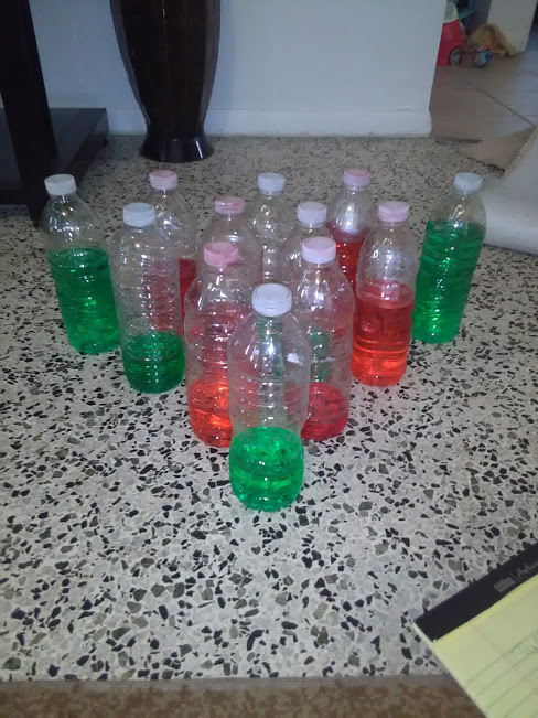 Fill bottles with water, then drop different color food coloring into bottles. Each color had a point value – Green – 1 pt Red=2pts