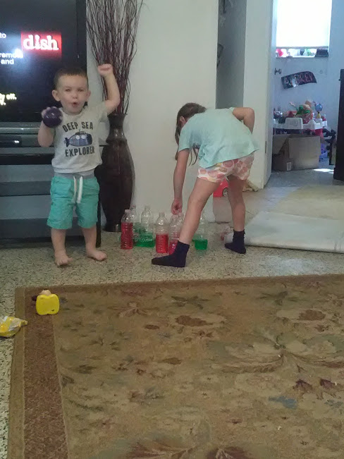 Have the kiddos take turns rollin the ball across the living room and have them total up the points of each roll, based on the colors they knock down.